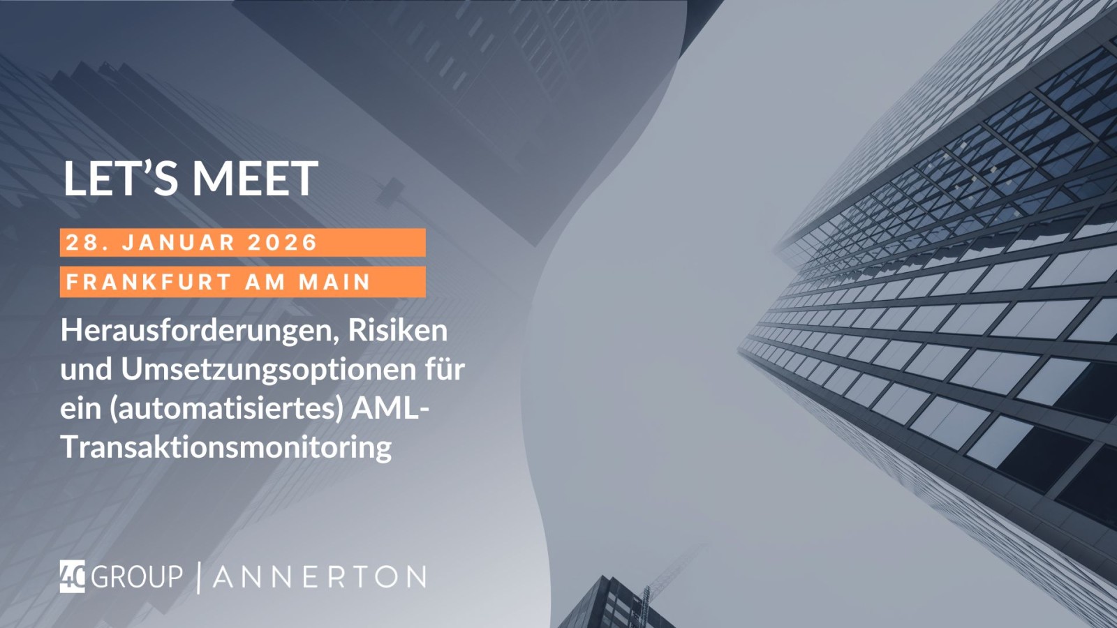 Wir laden Sie herzlich zu unserem praxisnahen Fach-Event „Herausforderungen, Risiken und Umsetzungsoptionen für ein (automatisiertes) AML-Transaktionsmonitoring" ein. In Kooperation von ANNERTON Frankfurt a.M. und der 4C GROUP AG bieten wir Ihnen die Möglichkeit, aktuelle Herausforderungen, Risiken und Lösungsansätze zu diskutieren und sich direkt mit Branchenexpert:innen auszutauschen.