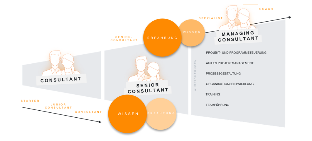 - Lernen von Erfahrenen, d.h. mehr Steuerungs- und Planungsverantwortung für die Projekte in enger Zusammenarbeit mit Erfahrenen übernehmen