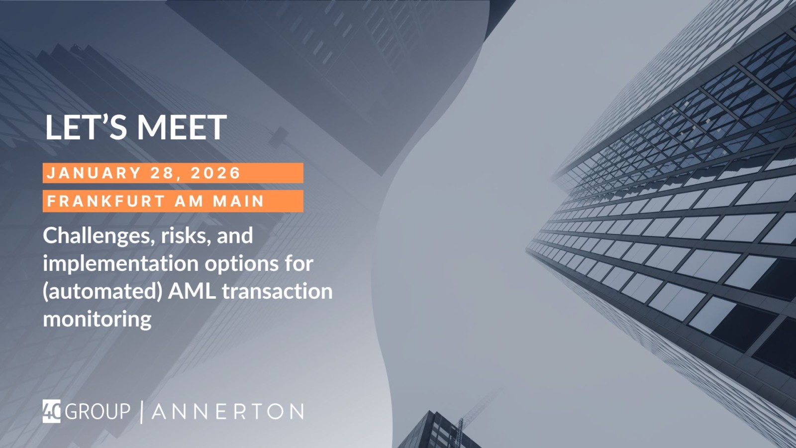 We warmly invite you to our hands-on professional event, “Challenges, Risks, and Implementation Options for (Automated) AML Transaction Monitoring.” In cooperation with ANNERTON Frankfurt a.M. and 4C GROUP AG, this event offers you the opportunity to discuss current challenges, risks, and potential solutions while engaging directly with industry experts.